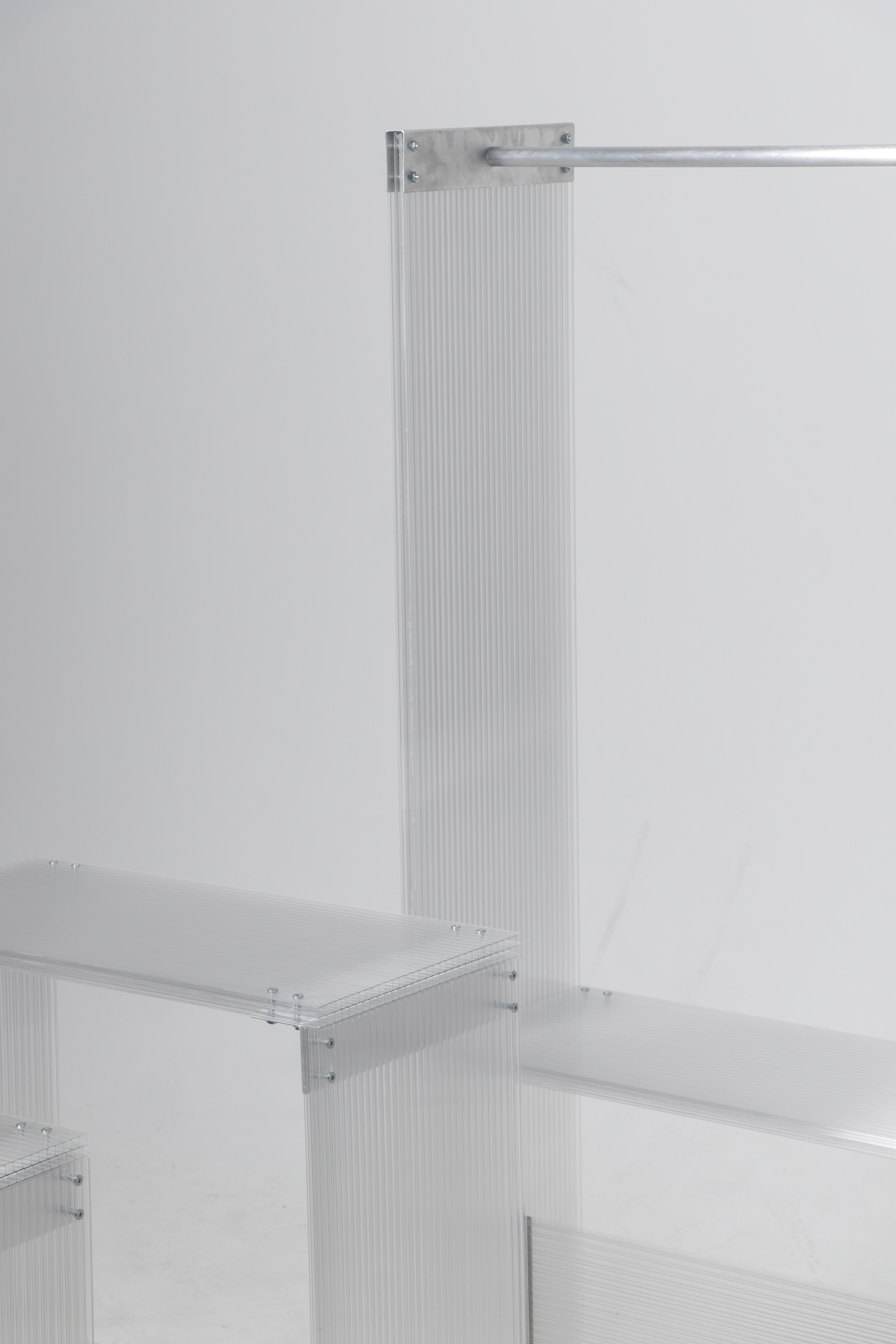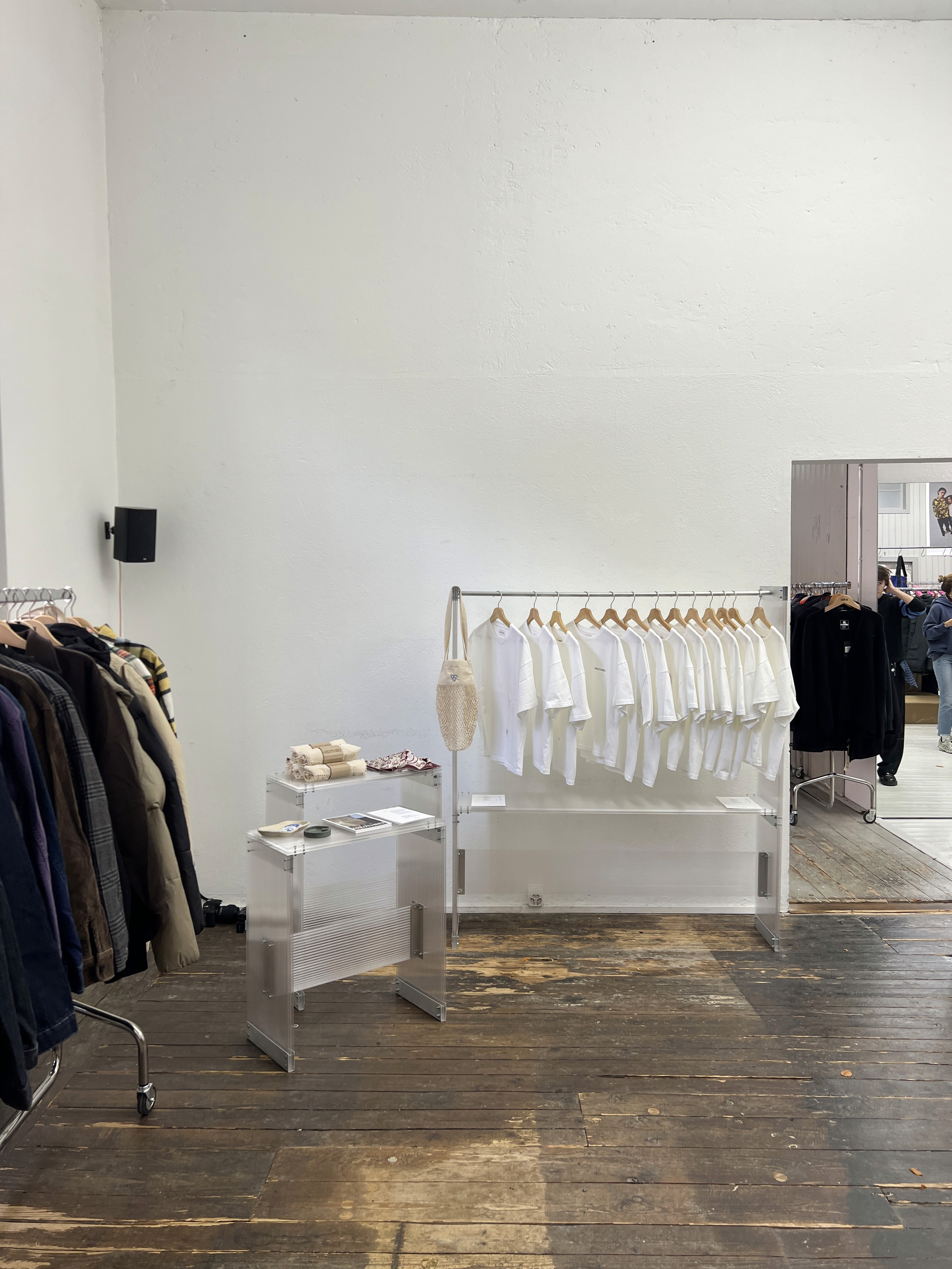 The design of this pop-up installation involved upcycling materials from the bachelor exhibition at ZHdK, shaping the creation process. I developed a shop display featuring a clothing rack, two displays, and a brand sign. My goal was to create something visually interesting that wouldn‘t overshadow the room or the products displayed. Key focuses included brand identity, storability, and environmental considerations.